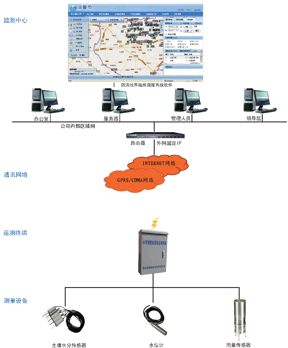 一、系統(tǒng)簡介 國家防汛抗旱指揮系統(tǒng)工程是關(guān)系到我國國民經(jīng)濟可持續(xù)發(fā)展和人民生命財產(chǎn)安全的一項戰(zhàn)略性水利基礎(chǔ)設(shè)施建設(shè),是國家水利信息化的主體工程。該工程的實施,對于提高我國防汛抗旱指揮調(diào)度決策現(xiàn)代化水平,減輕洪澇災害,保障人民群眾的生命財產(chǎn)安全,具有十分重要的意義和顯著的減災效益。 二、系統(tǒng)組成 v 監(jiān)控中心:中心服務器、外網(wǎng)固定IP、防汛抗旱指揮系統(tǒng)軟件; v 通信網(wǎng)絡: 基于移動無線GPRS或電信無線CDMA網(wǎng)絡; v 采集終端:水文水資源遙測終端RTU; v 計量儀表:雨量計、水位計、閘位計、土壤水分傳感器; v 供電方式:電池供電、太陽能供電、市電。