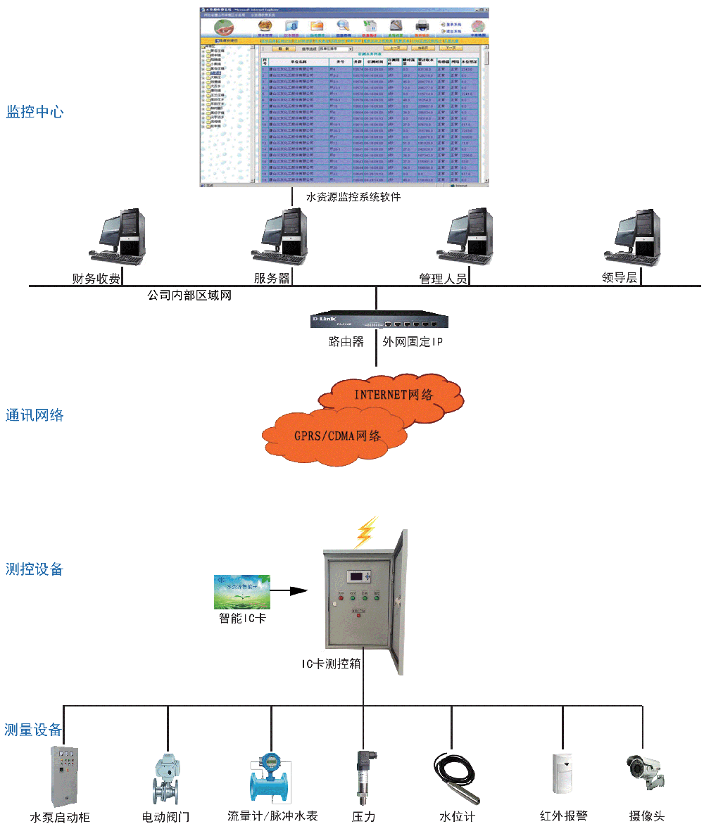 系統(tǒng)簡介 水資源實時遠程監(jiān)控管理系統(tǒng)是應(yīng)用在水務(wù)部門的一套智能化管理系統(tǒng),它通過對用水單位的實時監(jiān)測與控制,有效的保護水資源、合理利用水資源、加強用水單位的節(jié)水意識,是一套在水務(wù)行業(yè)中的理想解決方案。 系統(tǒng)組成 v 中心接收部分:中心服務(wù)器、固定外網(wǎng)IP、水資源管理系統(tǒng)軟件; v 傳輸網(wǎng)絡(luò):移動或電信網(wǎng)絡(luò); v 采集控制終端:水文水資源遙測終端RTU; v 儀表部分:流量計/積算儀、水位計、壓力變送器、控制柜/電動閥門; v 供電方式:市電、太陽能供電、電池供電。