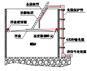 一般情況下,對灌區(qū)油罐實行集中監(jiān)控方式,每個油罐無論容積大小,均實行單獨(dú)監(jiān)測通道實時在線溫度檢測方式,避免同一監(jiān)測通道監(jiān)測多個油罐而造成的許多維護(hù)管理方面的不便,光纖光柵溫度探測器在油罐上的間隔可以按照3-6米布置,也可以做成雙環(huán)布設(shè),采用專用夾具將光纖光柵溫度探測器布設(shè)在浮盤/浮船擋油槽的密封圈附近,然后通過光纖/光纜把探測器串連起來,接入到控制室的信號處理器,通過信號處理器對采集到的信號進(jìn)行解調(diào),測量出現(xiàn)場溫度的實際情況,并將相關(guān)的信息傳遞到中央控制室。