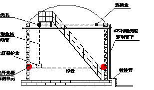 外浮頂油罐主要是以儲存原油為主,體積較大,必須設(shè)置火災(zāi)報警系統(tǒng)。在外浮頂儲罐上,一般采用專用夾具將光纖光柵感溫火災(zāi)探測器布設(shè)在浮盤/浮船密封圈附近。光纖光柵探測器使用傳輸光纜連接,在儲罐內(nèi),傳輸光纜沿滑梯敷設(shè),并垂落至浮盤處與光纖光柵探測器連接。其中滑梯至罐底浮盤處的傳輸光纜采用防爆撓線管敷設(shè)。